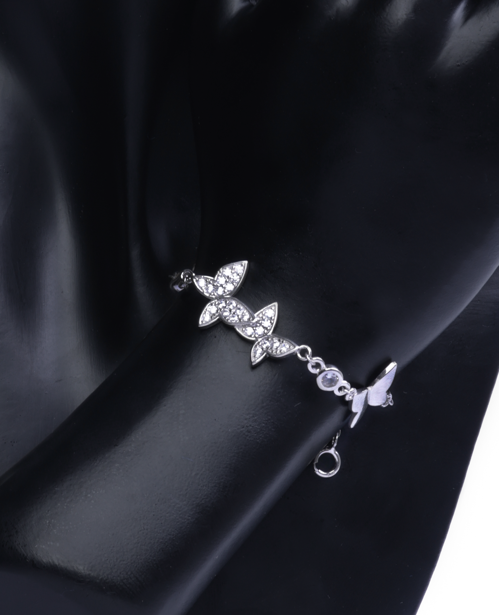Graceful and radiant, the Butterfly Halo Bracelet is crafted in sterling silver and adorned with sparkling stones that illuminate each butterfly charm. Symbolizing freedom and transformation, the shimmering design creates a halo-like glow around the wrist, making it a perfect blend of elegance and meaning.