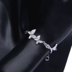 Delicate and enchanting, the Crystal Butterfly Bracelet is crafted in sterling silver and adorned with dazzling crystals shaped into graceful butterfly wings. A timeless symbol of transformation and beauty, this piece captures light with every movement, adding elegance and sparkle to your wrist. Finished with an adjustable chain and heart charm, it’s both romantic and versatile.