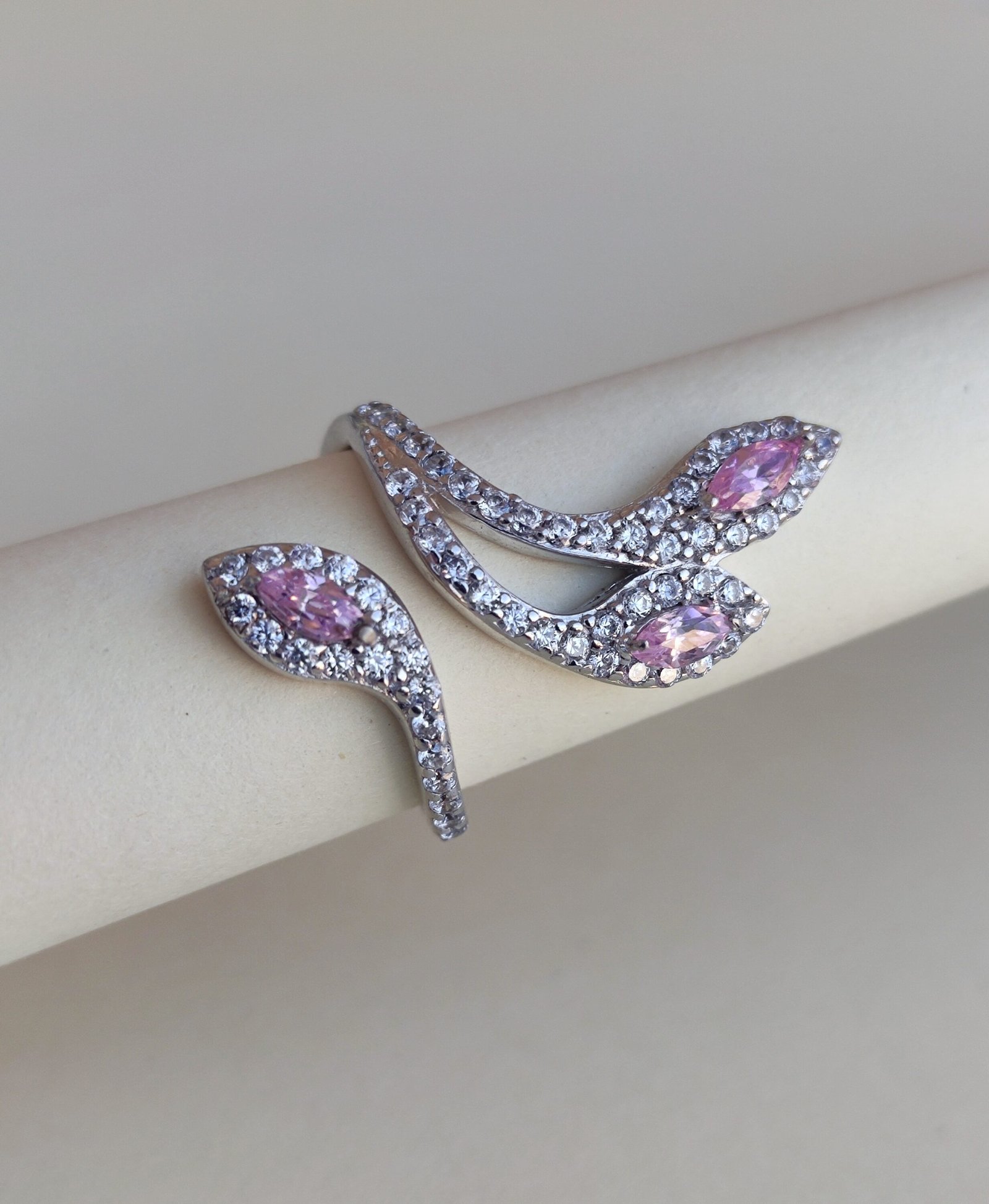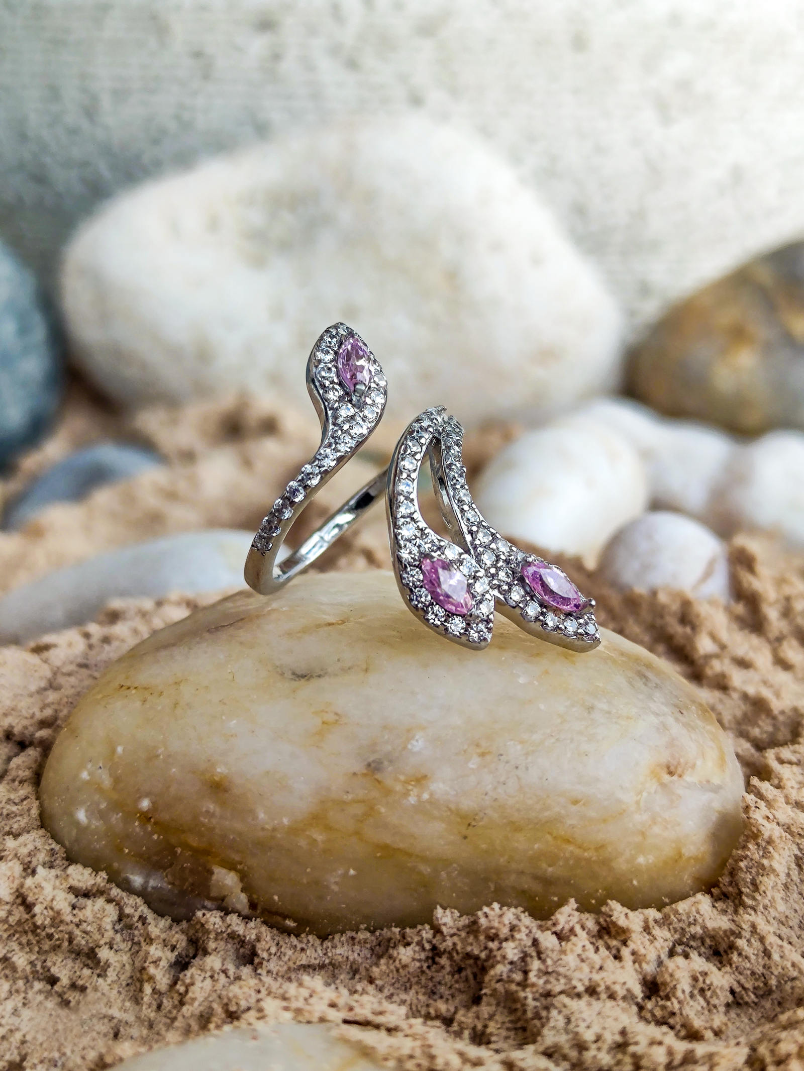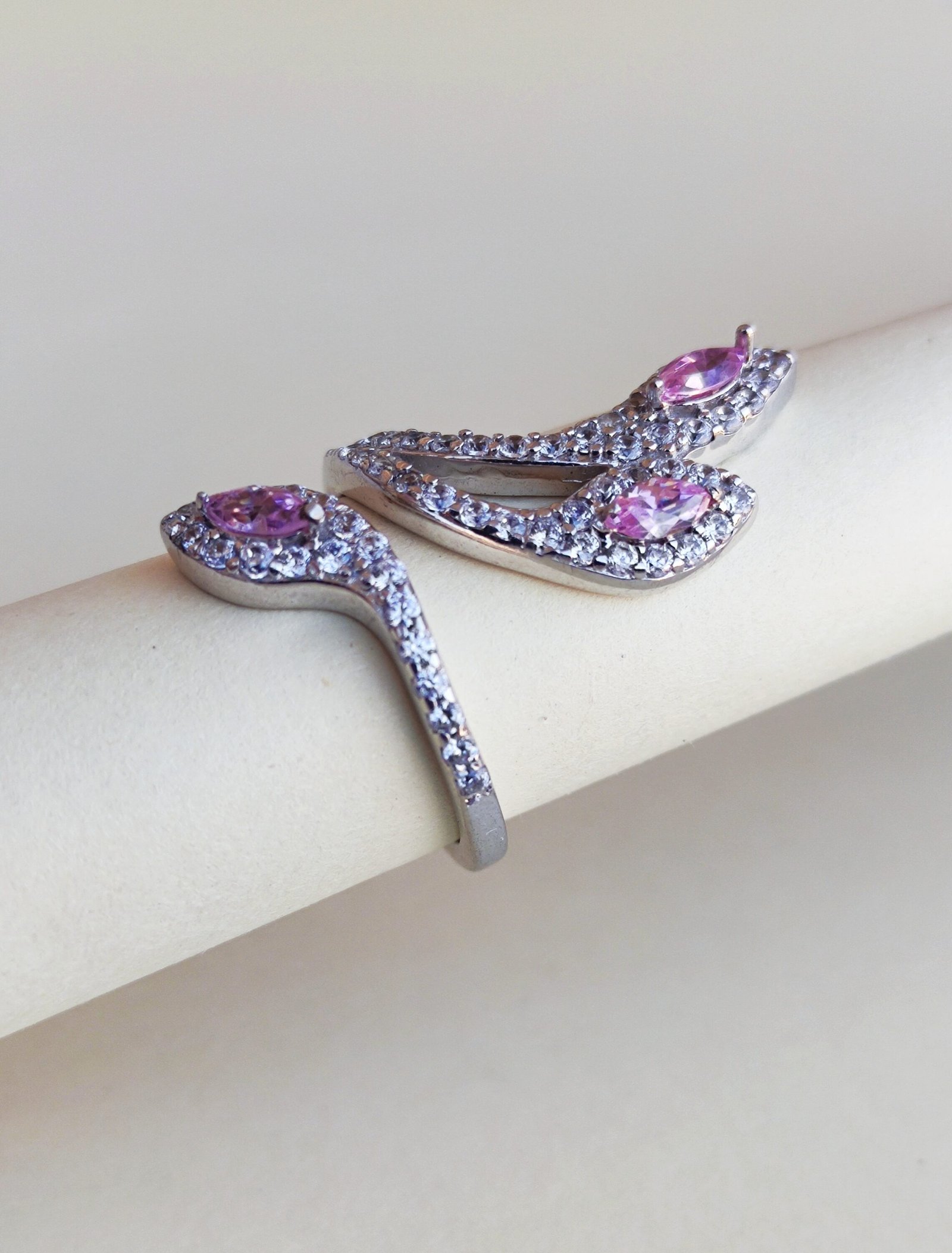 Graceful and enchanting, the Lavender Wings Ring is crafted in sterling silver with flowing wing-like curves set with shimmering pavé crystals. Accented by soft lavender-hued stones, it symbolizes freedom, elegance, and transformation. Its open wrap-around design makes it a striking statement piece that radiates both delicacy and strength.