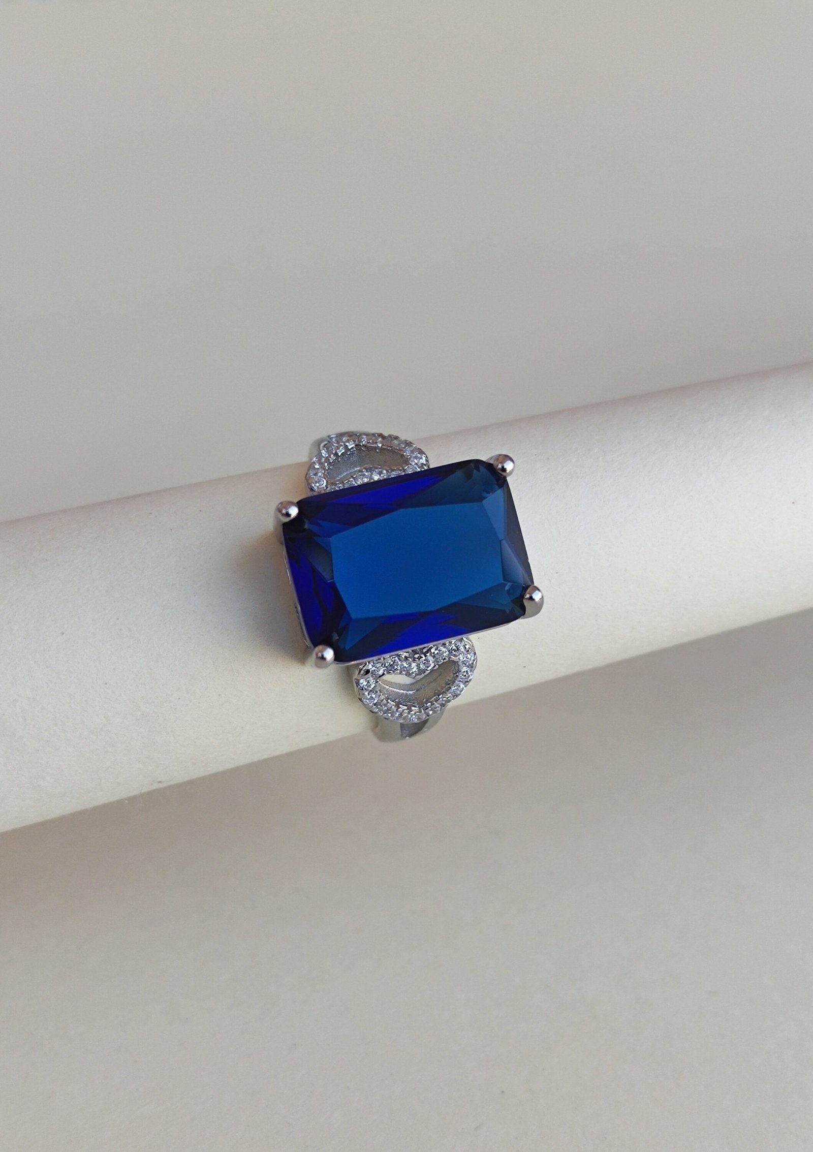 Bold and mesmerizing, the Midnight Mirage Ring features a striking rectangular deep-blue gemstone set in sterling silver with pavé-accented side details. Its rich midnight hue evokes mystery and elegance, symbolizing wisdom, depth, and allure. A true statement piece designed to captivate and inspire.