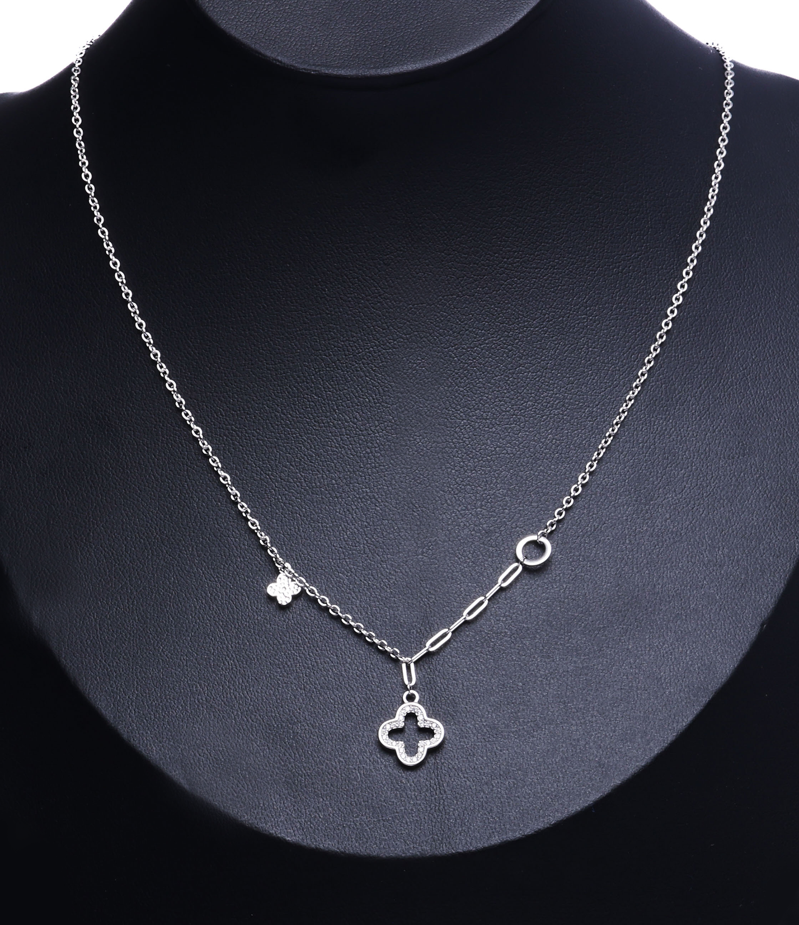 Design: Asymmetrical chain with clover pendant and charm details