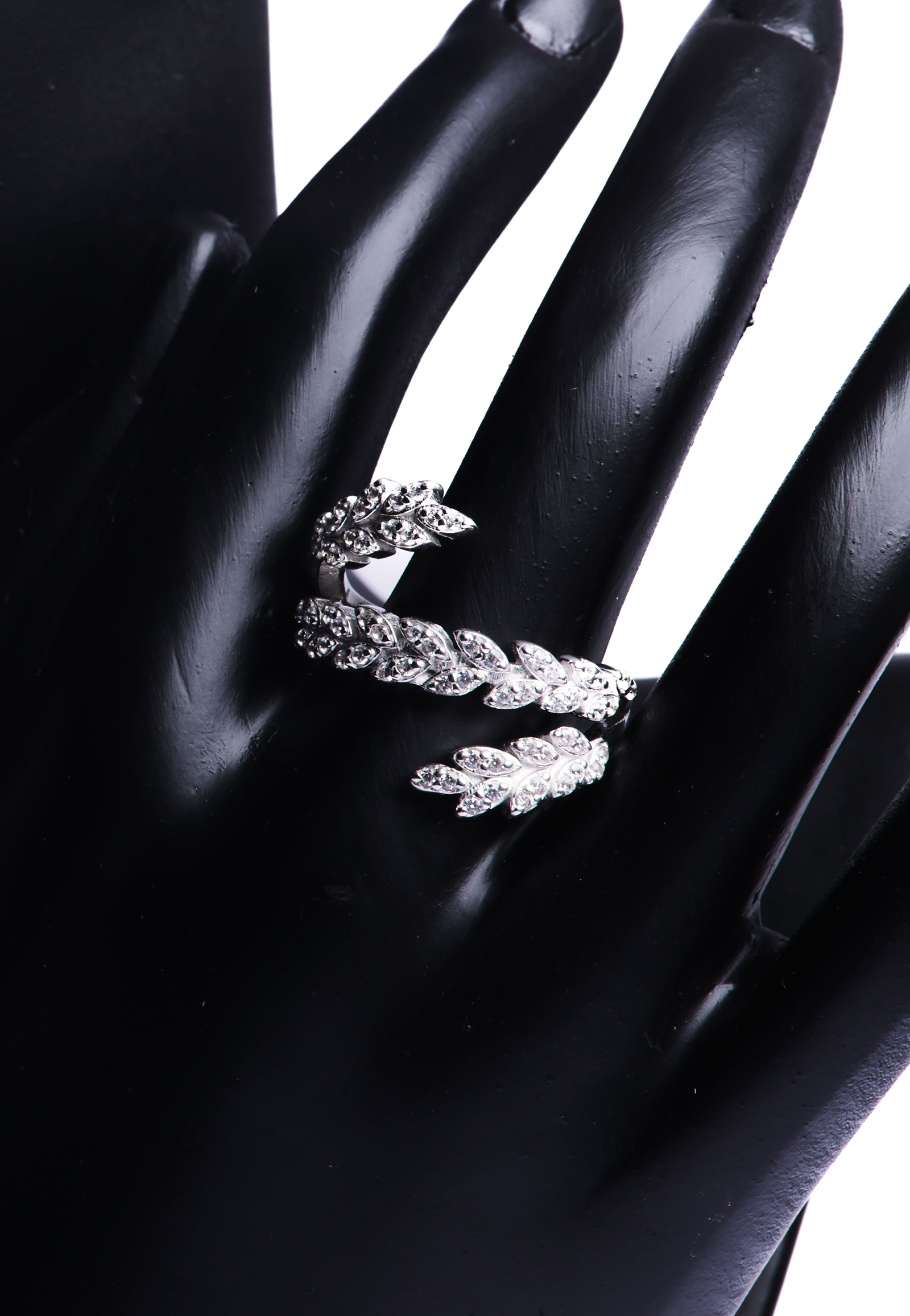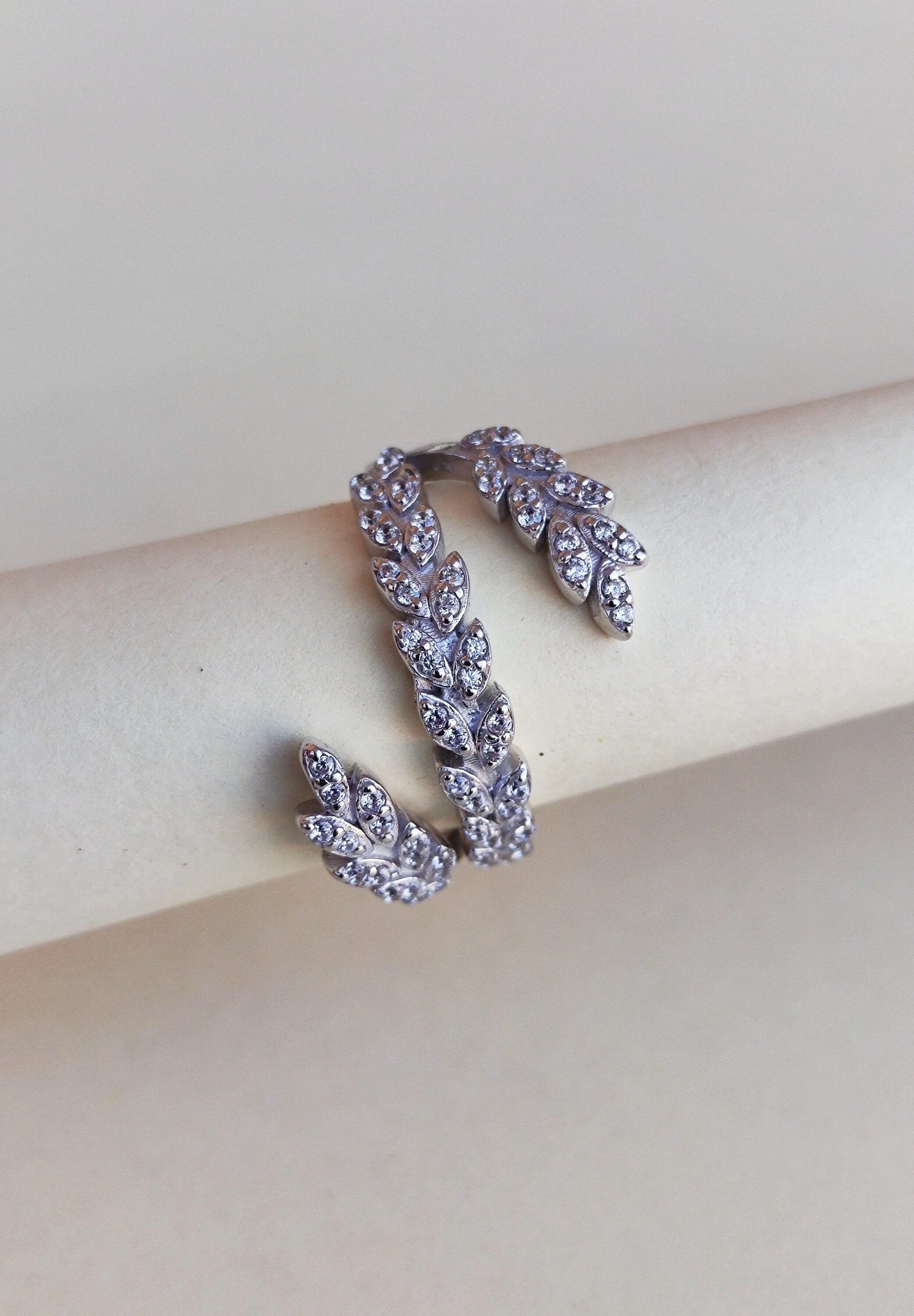 Design: Spiral wrap-around band with leaf motifs and pavé crystals