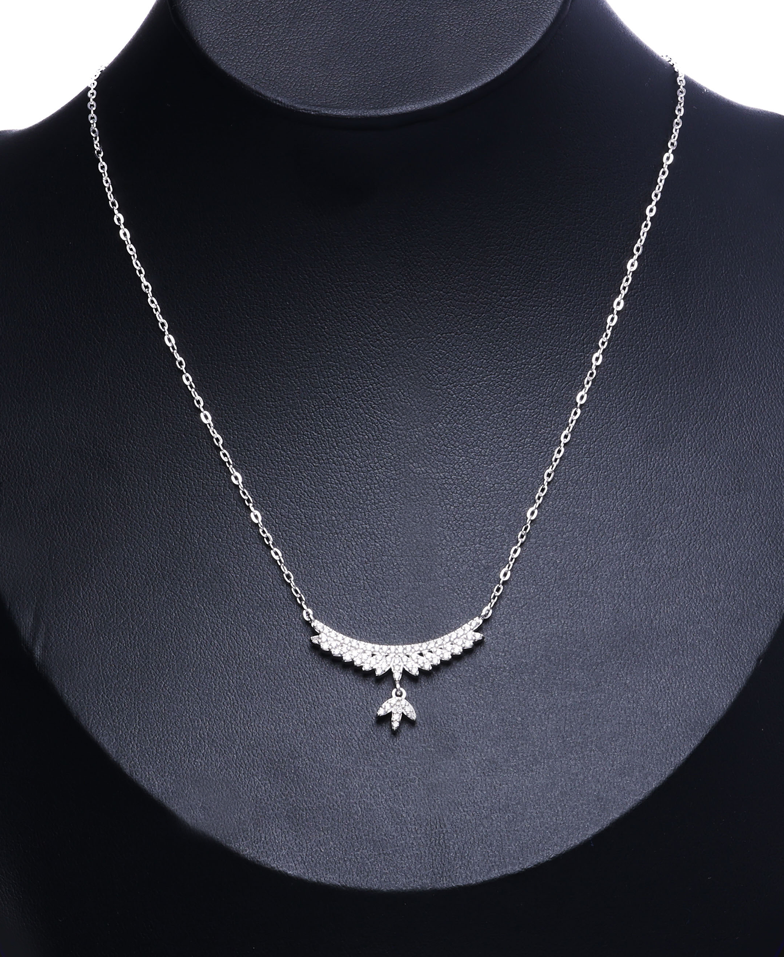 This elegant Italian silver necklace features a crescent-inspired design adorned with shimmering stones, symbolizing grace and femininity. A delicate dangling charm beneath adds movement and sparkle, making it a refined accessory that enhances both everyday outfits and special occasion looks.