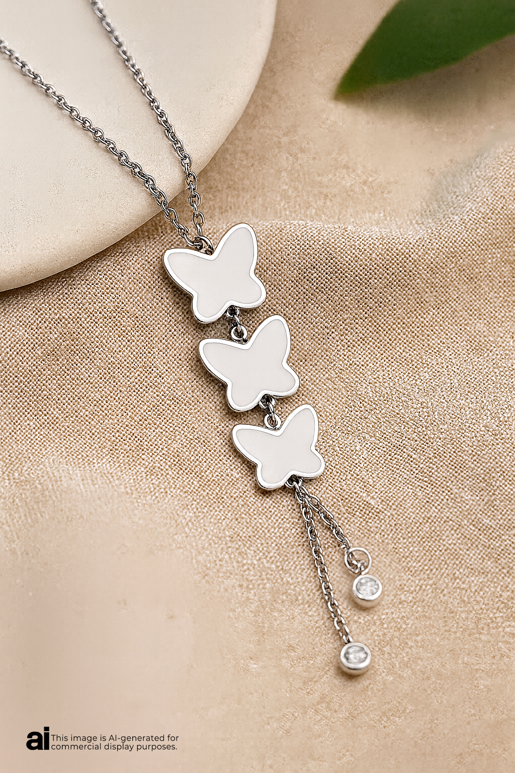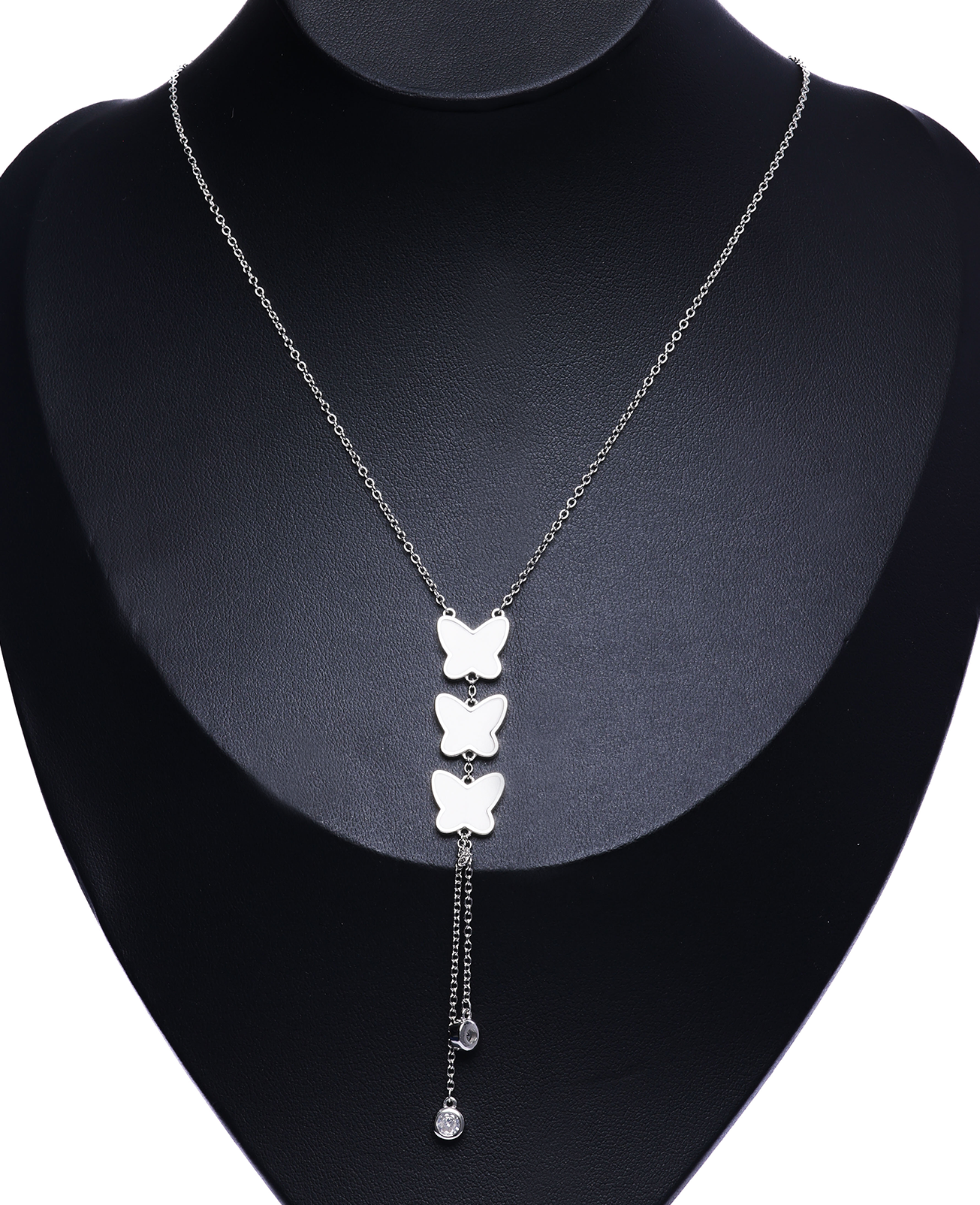 This elegant necklace features three polished butterfly charms arranged in a vertical design, symbolizing freedom and transformation. A delicate drop chain with sparkling stone accents extends below, adding movement and a touch of sophistication. Stylish and versatile, it’s a perfect accessory for both everyday wear and special occasions.