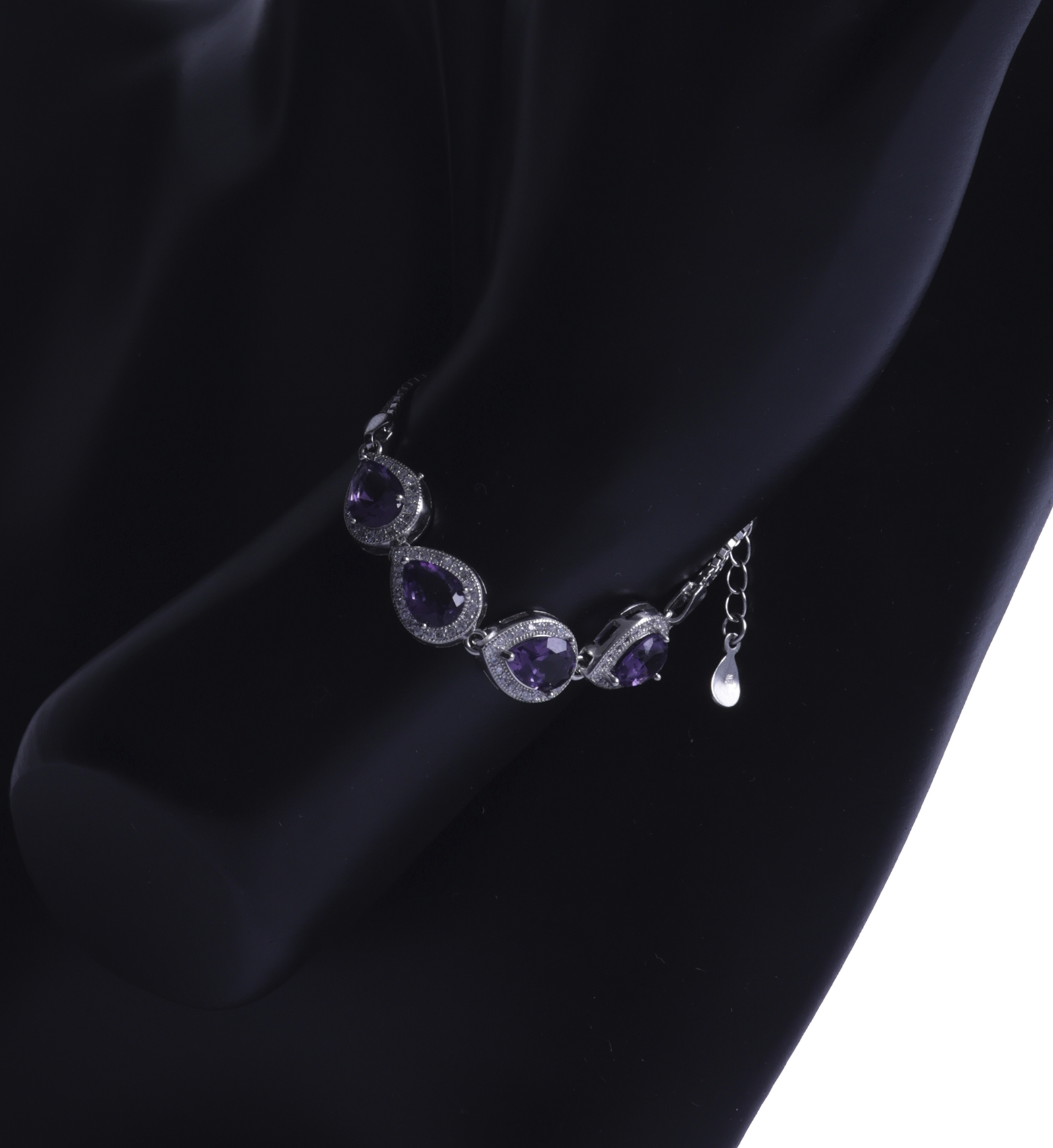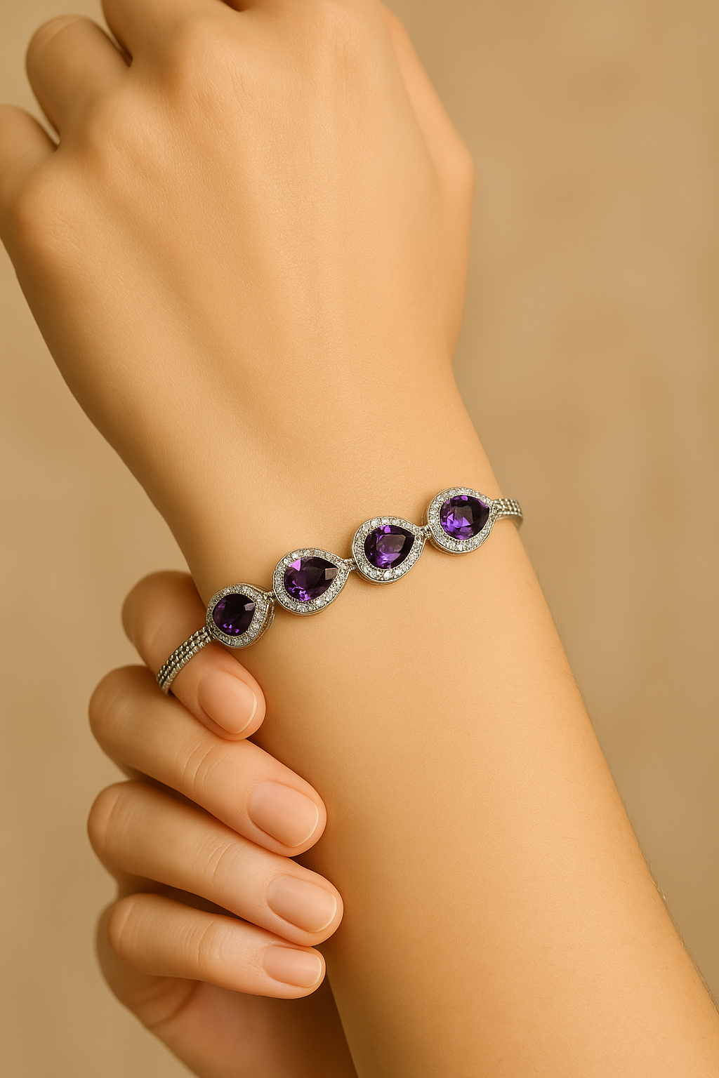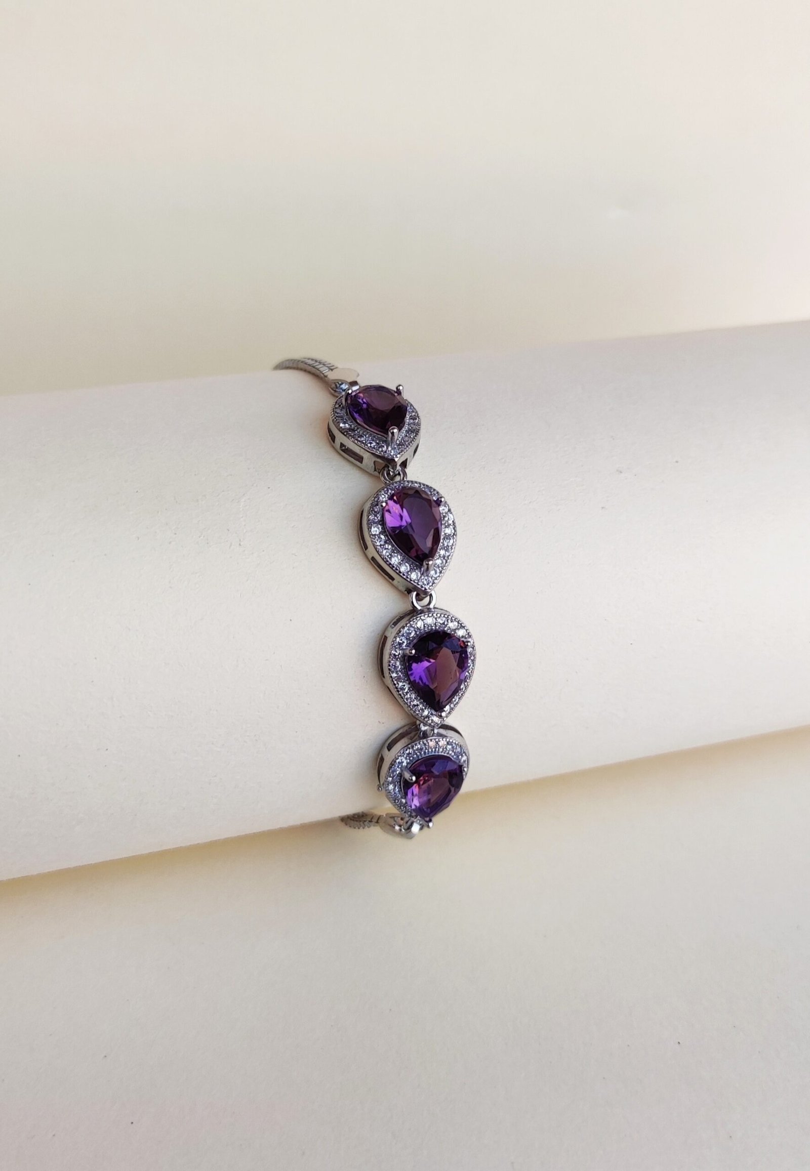Regal and radiant, the Violet Crown Bracelet is crafted in sterling silver and adorned with pear-shaped amethyst-hued crystals framed by shimmering halos. Exuding elegance and sophistication, this piece symbolizes royalty, wisdom, and inner strength. With its adjustable design and timeless charm, it’s a statement of luxury fit for a modern queen.